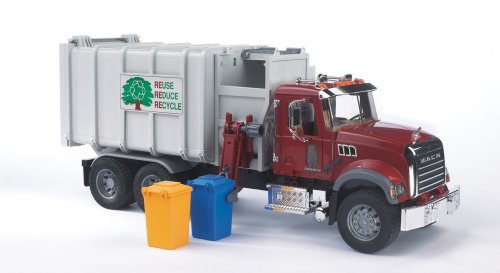 This Bruder MACK side loading garbage truck features a working grapple arm that unloads each of the included bins into the truck body, where screw extruders move the contents to the back. Tough German-made toy provides years of heavy-duty play time. Recommended Ages (years): 4 and up, Material Type: Plastic, Movement: Opening lift gate, tilting dump, folding mirrors, grapple arm moves, and hood opens, Dimensions L x W x H (in.): 23 5/8 x 7 5/16 x 10 3 /16, Safety Warning: Choking hazard - small parts